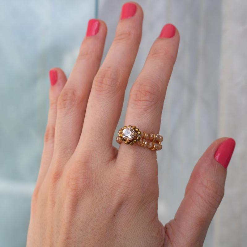 O Anel Delicadeza Clarisse combina a atemporalidade das pérolas com o brilho brilho delicado do cristal tcheco. É uma peça confeccionada com cristais, pérola em acrílico e metais com banho de ouro e verniz protetor.