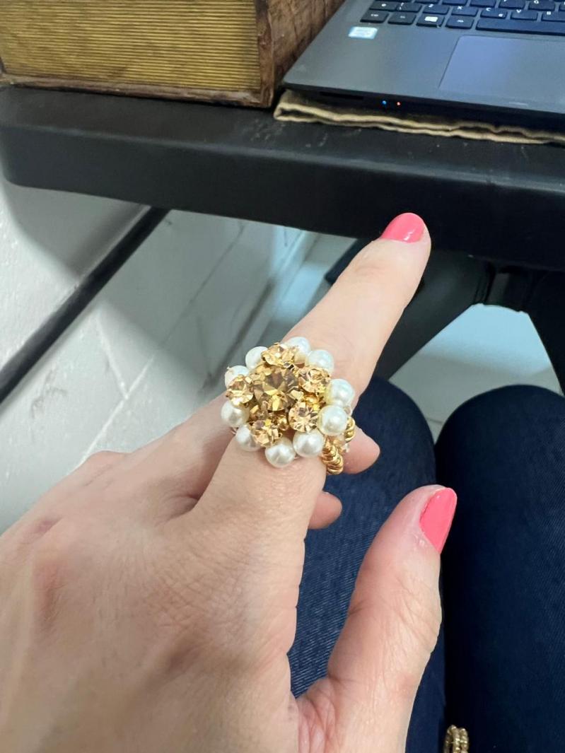 O Anel Mandala Clarisse combina a atemporalidade das pérolas com o brilho dos cristais. É uma peça confeccionada com cristais, pérola em acrílico e metais com banho de ouro e verniz protetor.