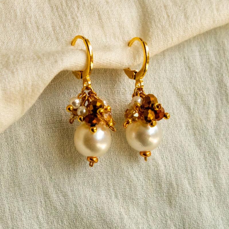 Brinco em argola click. O brinco Balagandã Clarisse é uma peça confeccionada com cristais, pérola em acrílico e metais com banho de ouro e verniz protetor.