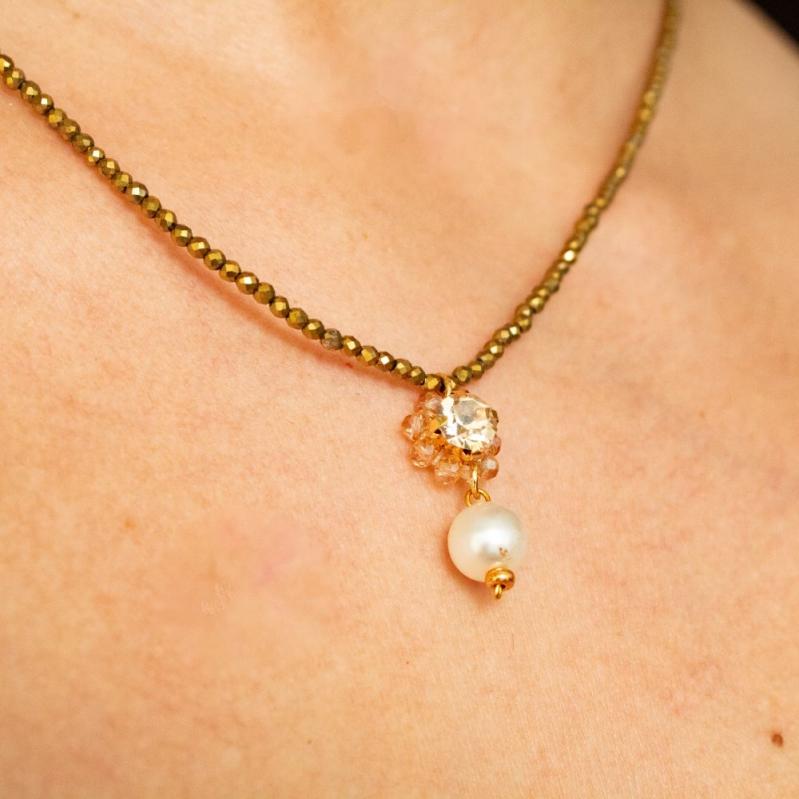 O Colar Dourado Clarisse é composto por cristais nº 1 em e um pingente com cristal tcheco e pérola em acrilico.