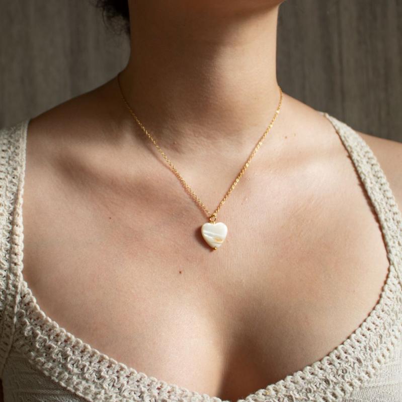 Colar Madrepérola Clarisse une a delicadeza da madrepérola e o romantismo do coração. O Colar é composto por corrente banhada a ouro e um pingente coração de madrepérola de 2cm.